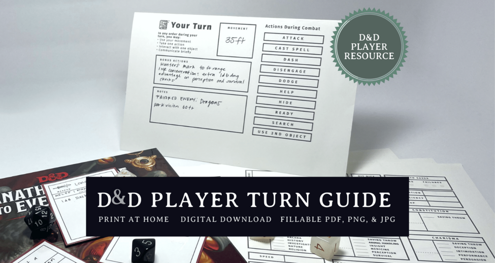 Combat can be chaotic and difficult to remember what to do for your character. This player turn guide will help you keep track of your possible actions during each round. With this minimal, easy-to-fold guide, you'll always know what to do when it's your turn!