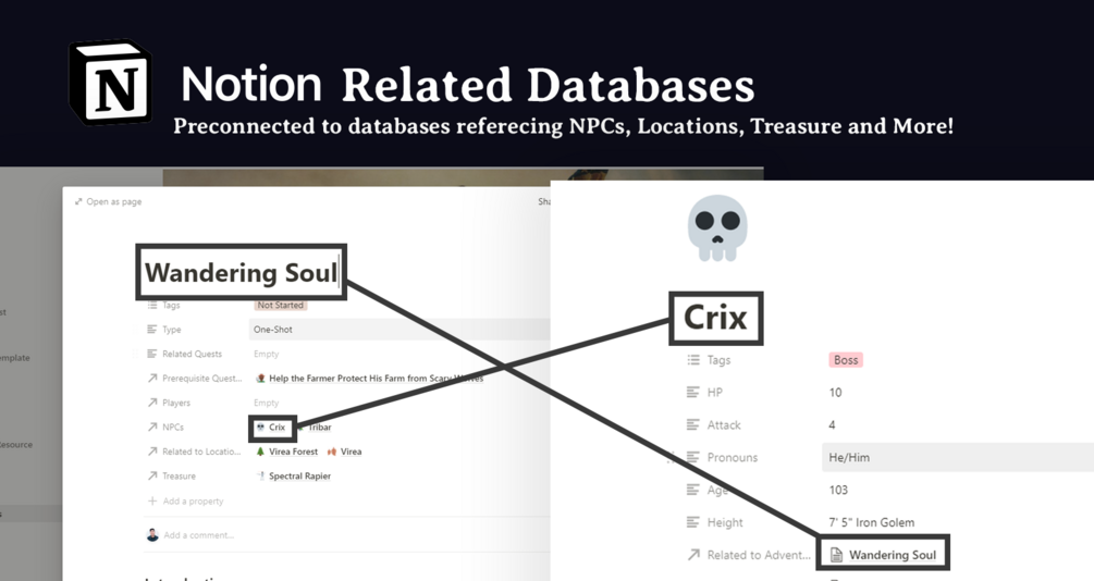 Save time and organize your Quest RPG campaign with this template for Notion. Included are several pre-made templates and databases for your quests, campaign locations, treasure, NPCs, player characters, an in-game guide resource, a trials planner, and more!